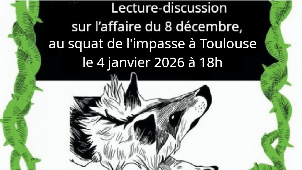 On propose un petit atelier de lecture de textes issus de brochures sur l’affaire du 8/12. Ce sera l’occasion d’en savoir plus sur cette affaire (qui a maintenant 5 ans, et dont l’appel se tiendra à Paris en mai prochain), et on pourra discuter plus généralement sur la répression, la prison, l’anti-terrorisme, la solidarité,..