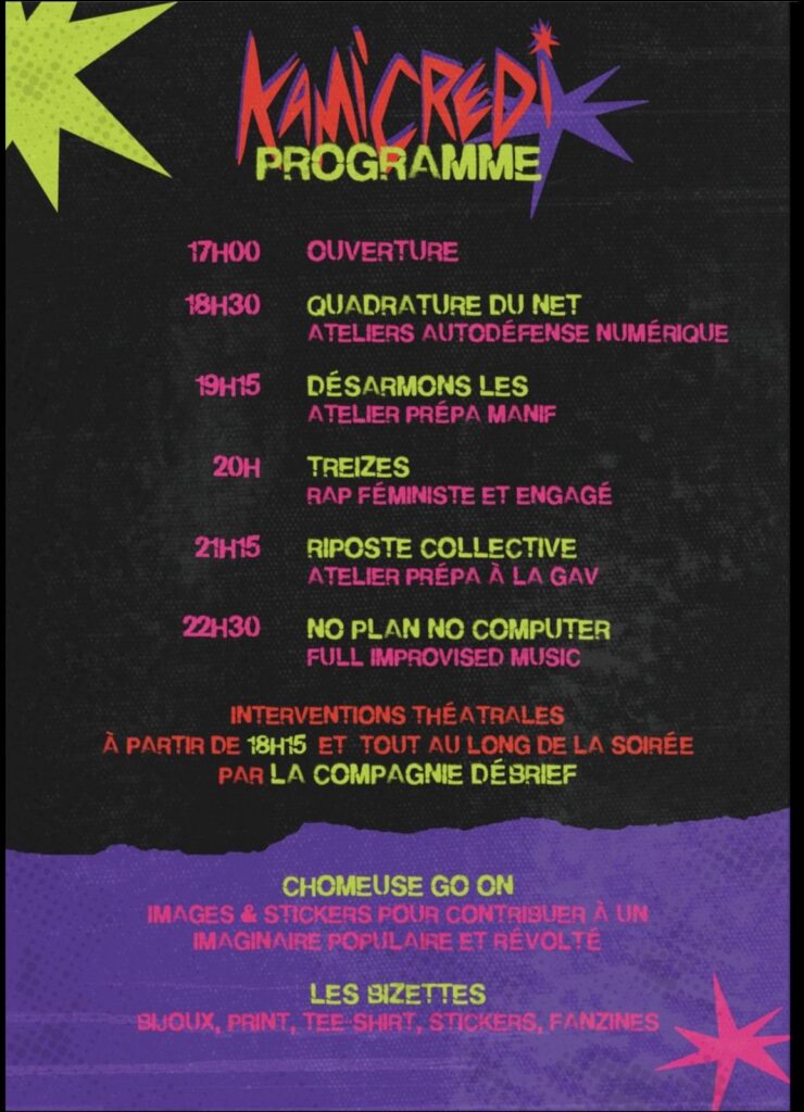 Un pur moment avec ce qu’on fait de meilleur : des expo pour observer, des concerts et perfs pour festoyer, des ateliers anti-rep pour gagner plus de points au grand jeu de la lutte quotidienne contre la répression physique et numérique de notre société préférée ♥️♥️♥️