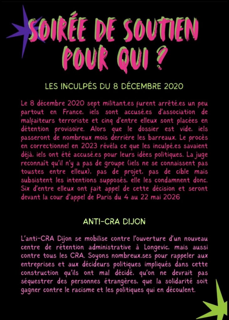Et non pas pour rire, ça on déteste, pour filer plein de moula aux caisses pour les inculpés du 8 décembre et à l’anti-CRA de Dijon. Aux prisons on préfère les feux de joie !
